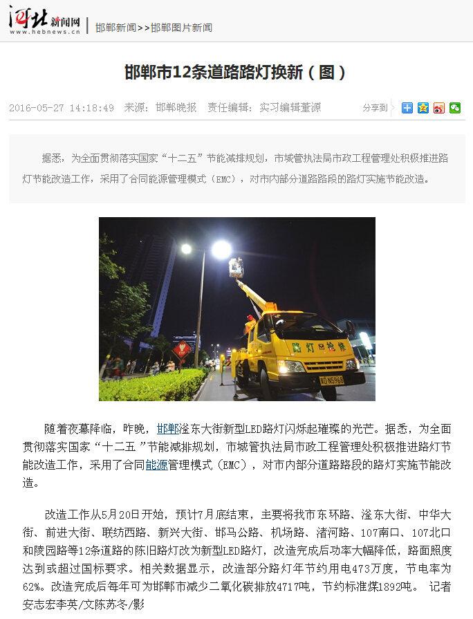 邯郸市以合同能源管理模式(EMC)改造的12条道路是采用西安立明公司研发生产的LED道路照明灯,本次共计改造高压钠灯7136盏。改造完成后灯具功率大幅度降低,路面照度达到或超过国家标准。
